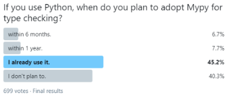 In a recent Twitter poll, 45% of respondents said they already use Mypy, while 40% say they never plan to use it.